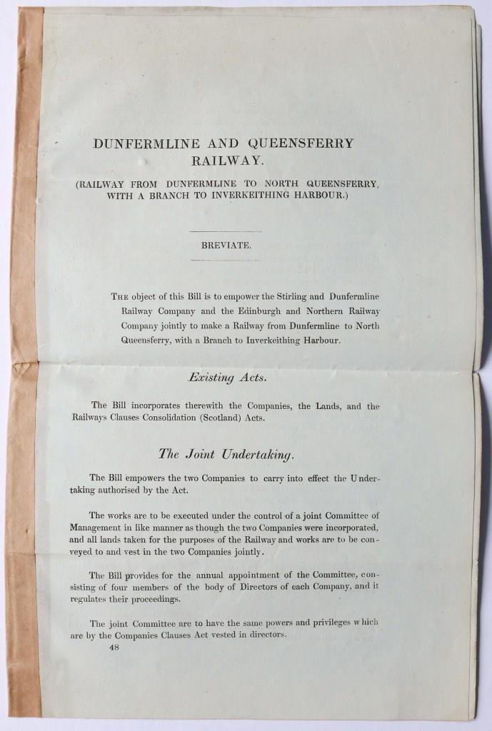 27Dunfermline & Queensferry Railway ‘Breviate’ showing abbreviated details of the bill to allow the railway to build a railway between Dunfermline and Queensferry. 4pp dated 1847. Spine taped. £18