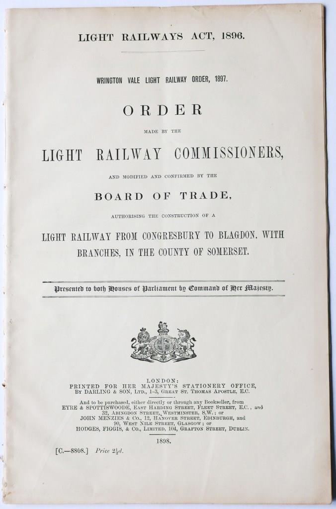 30Wrington Vale Light Railway order under the light railways act to allow the construction of the railway. 18pp, disbound, dated 1898. £5