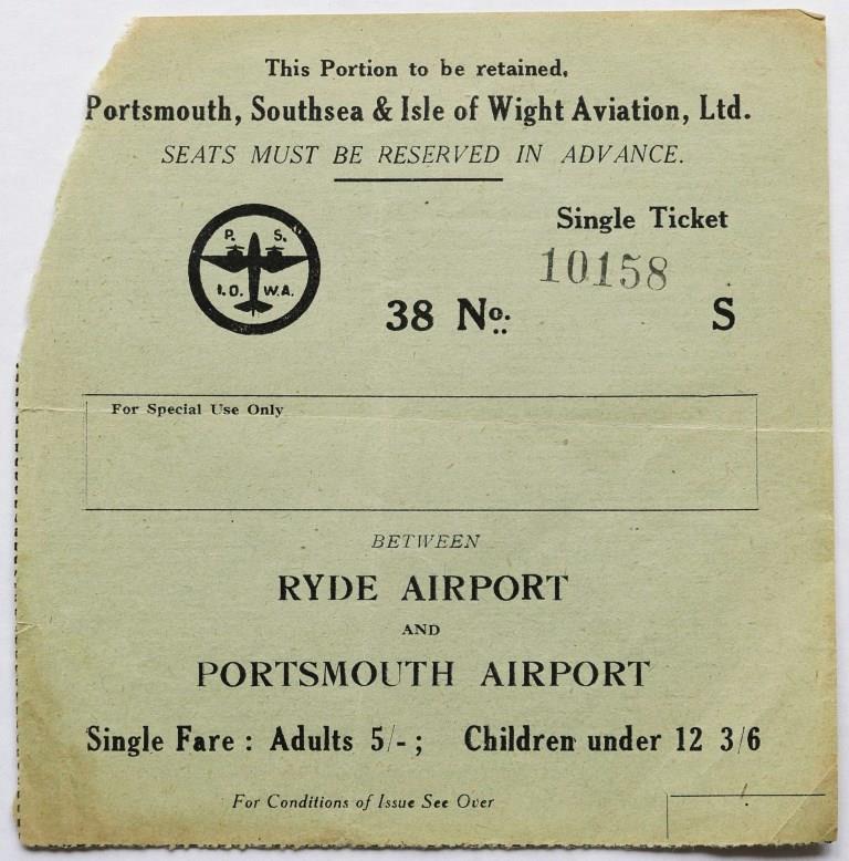 35Portsmouth, Southsea and Isle of Wight Aviation Ltd paper ticket for use between Ryde Airport and Portsmouth Airport. Unused. Later version of previous lot. Small loss top l/h corner. £11