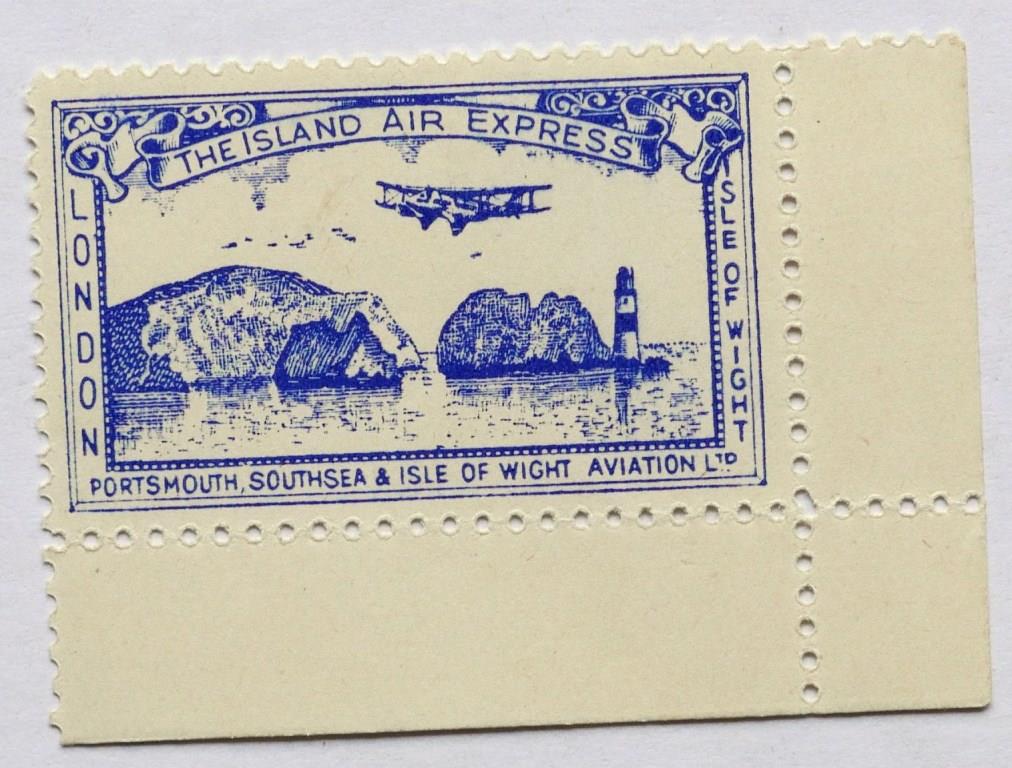37Stamp for the London-Isle of Wight ‘Island Air Express’ operated by Portsmouth, Southsea and Isle of Wight Aviation Ltd. Blue print showing illustration of plane passing over the Needles. Not used. £18