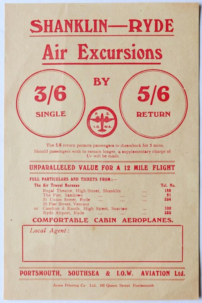 39Portsmouth, Southsea and Isle of Wight Aviation Ltd smaller sized handbill advertising Shanklin – Ryde air excursions. Red print, circa 1930s. £19
