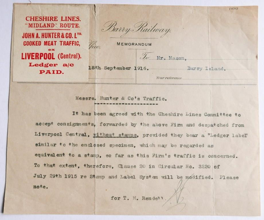 796CLC pre grouping wagon label ’from Huskisson Station Liverpool to Tarvin and Barrow via Baguley’. Used 1889. £8