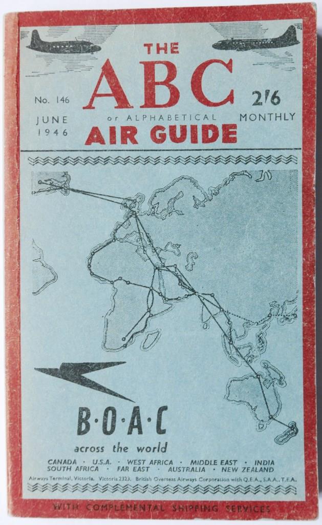 46Skinner & Co published ABC Air Guide. Illustrated cover showing BOAC route map, 200+pp plus fold out map, dated June 1946. £18