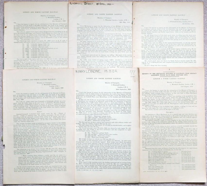 76 reports into accidents and collisions on the LNER. Waverley July 1929, Marylebone August 1924, West Hartlepool July 1923, Selby August 1923, Liverpool St April 1923, Finsbury Park November 1926. £32