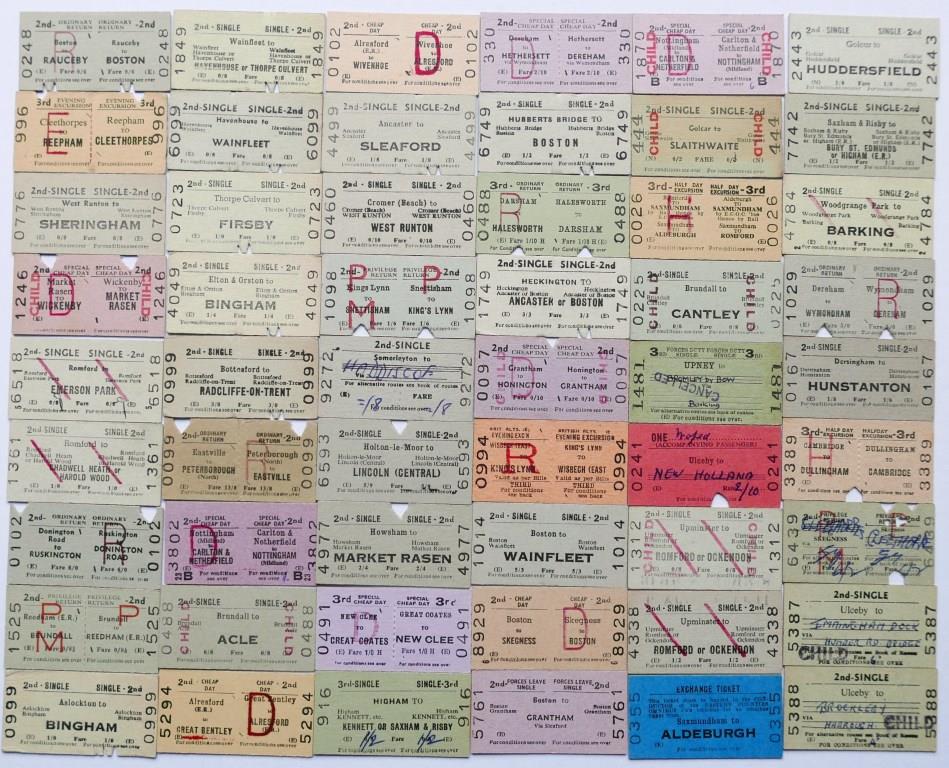 751Approx 60 BR(NE or E) whole Edmondson tickets from the early 1960s, all on purple coloured card. Includes closed stations, mostly issued. £95