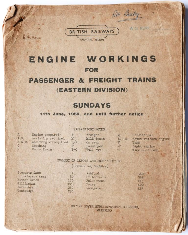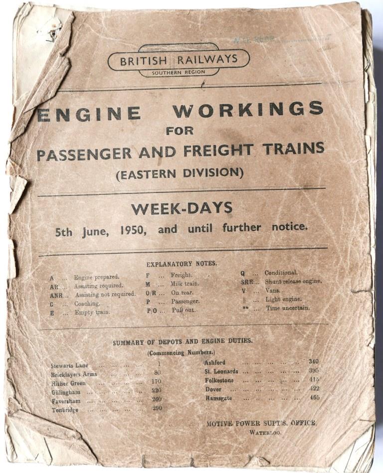83BR(S) Eastern Division booklet ‘Engine Workings for Passenger and Freight Trains – weekdays’. Card covers, 250pp, dated June 1950. Covers very grubby and worn, staple removed, contents OK. £170