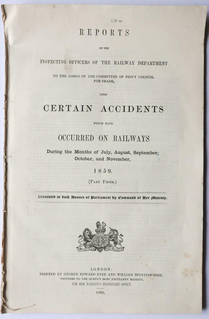 9Report of the Inspecting Officers of the Railway Department on certain accidents which have occurred during July – November 1859. 50pp, disbound. £36