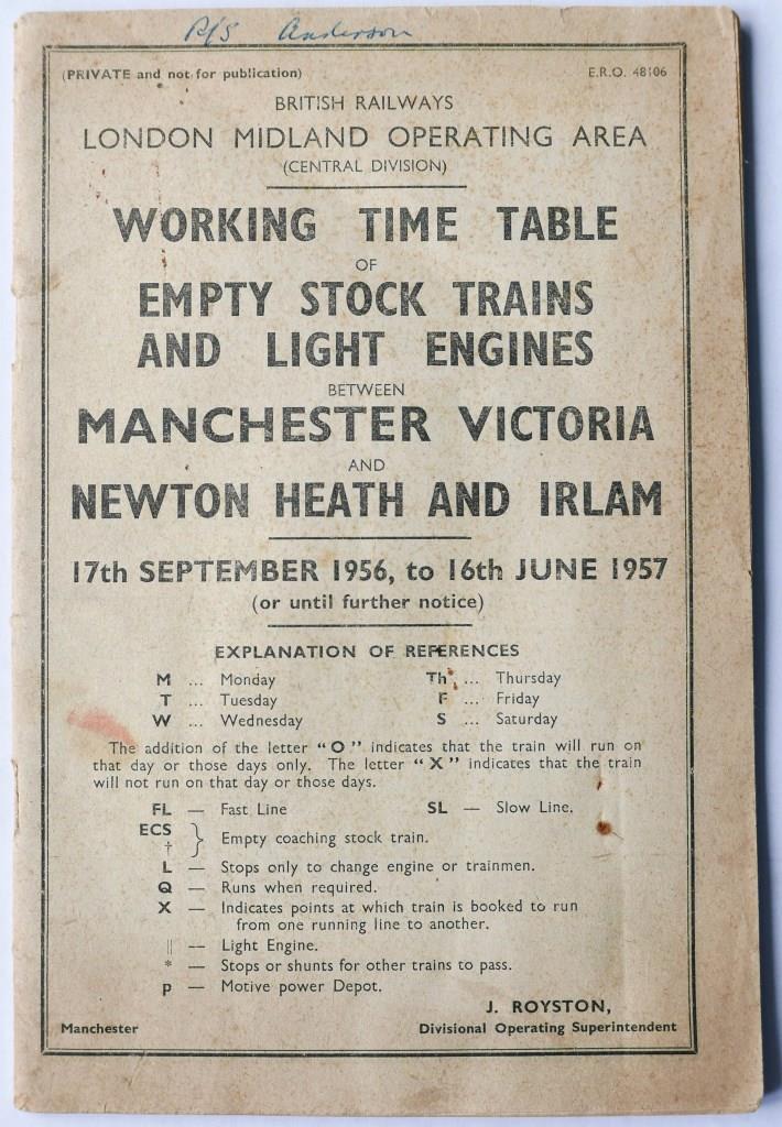 | 121 | BR(M) Central Division working timetable of Empty Stock Trains and Light Engines between Manchester Victoria and Newton Heath & Irlam. 63pp dated September 1956. Slight foxing to covers. | £70 |  |
