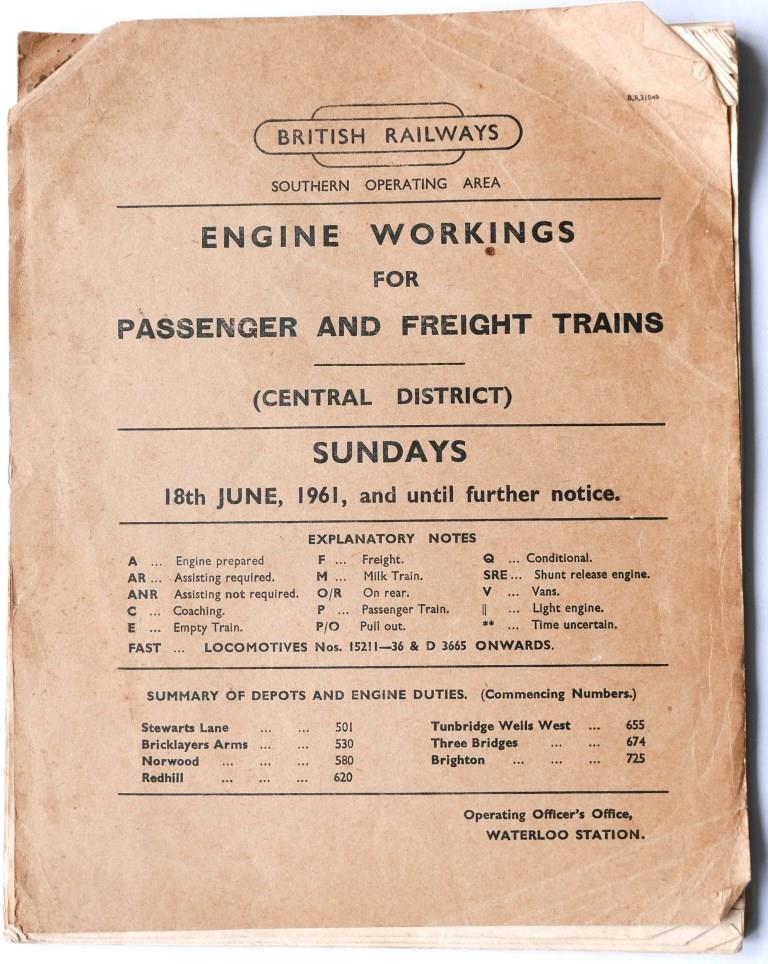 | 135 | BR(S) Central District booklet ‘Engine Workings for Passenger and Freight Trains – Sundays’. Card covers, 43pp, dated September 1961. | £5 |  |