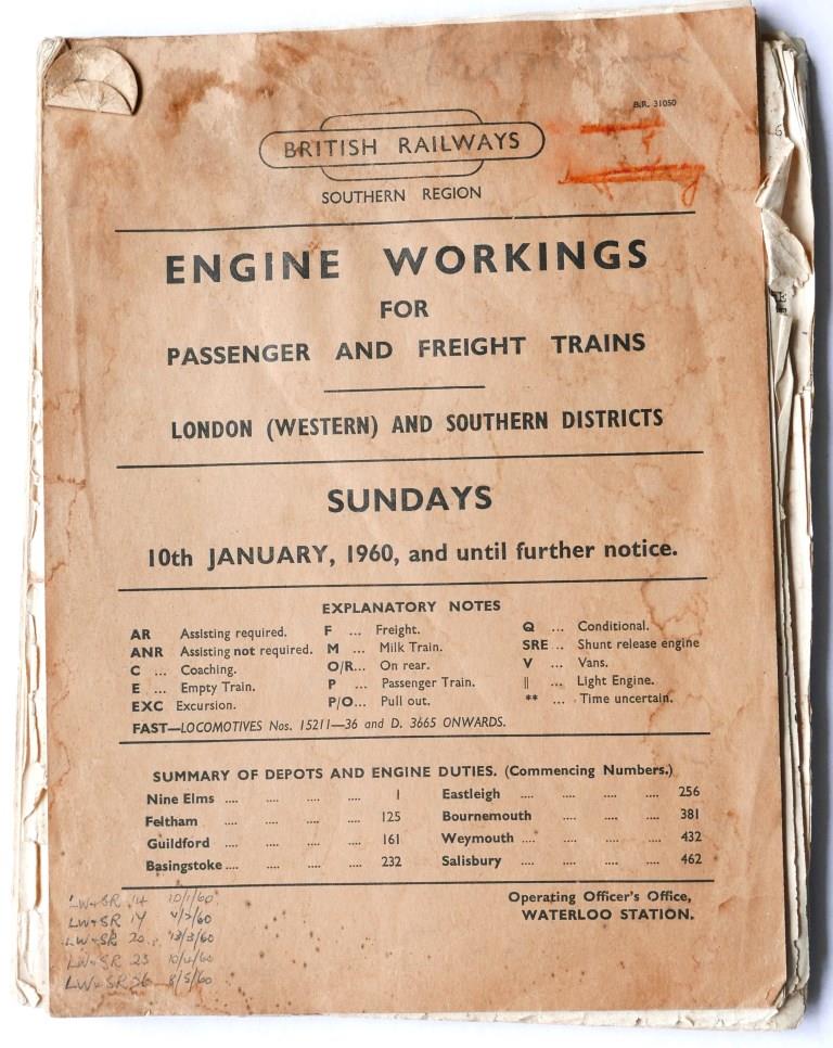 | 137 | BR(S) London (Western) and Southern Districts booklet ‘Engine Workings for Passenger and Freight Trains – Sundays’. Card covers, 55pp, dated January 1960. Many amendments added, worn and stained. | £65 |  |