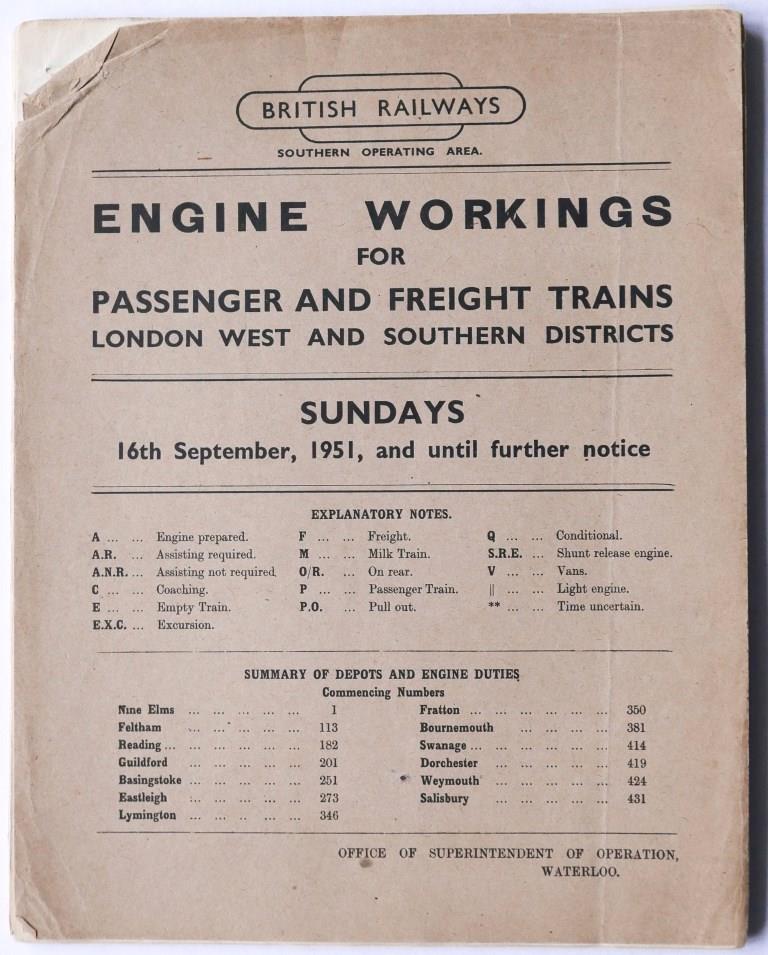 | 65 | BR(S) Western District booklet ‘Engine Workings for Passenger and Freight Trains – Sundays’. Card covers, 29pp, dated June 1953. | £38 |  |