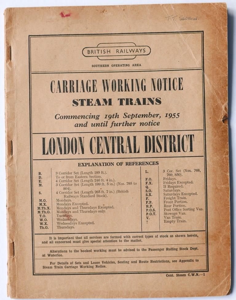 | 62 | BR(S) London Central District Carriage Working Notice Steam Trains. 66pp dated September 1955. | £6 |  |