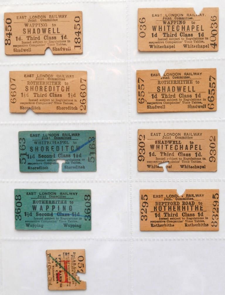 | 704 | 8 East London Railway whole Edmondson tickets and 1 half Edmondson ticket. Includes two 2nd class examples. All issued, slight creasing to a couple. | £46 |  |