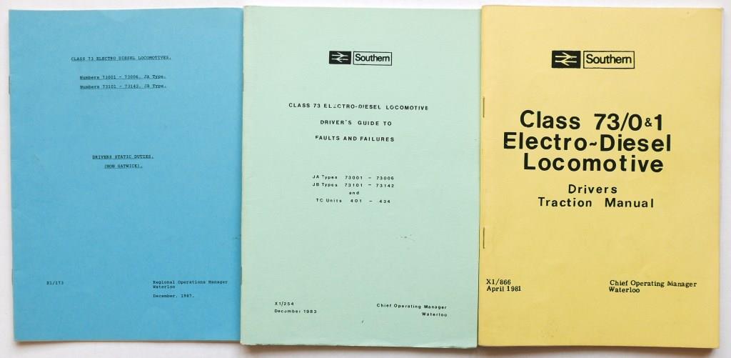 | 83 | 3 BR manuals relating to the operation of class 73 electro diesel locos including Drivers Static Duties (11pp, 1987), Guide to Faults and Failures (55pp, 1983, ink amendments), Drivers Traction Manual (74pp, 1981, ink amendments). | £15 |  |