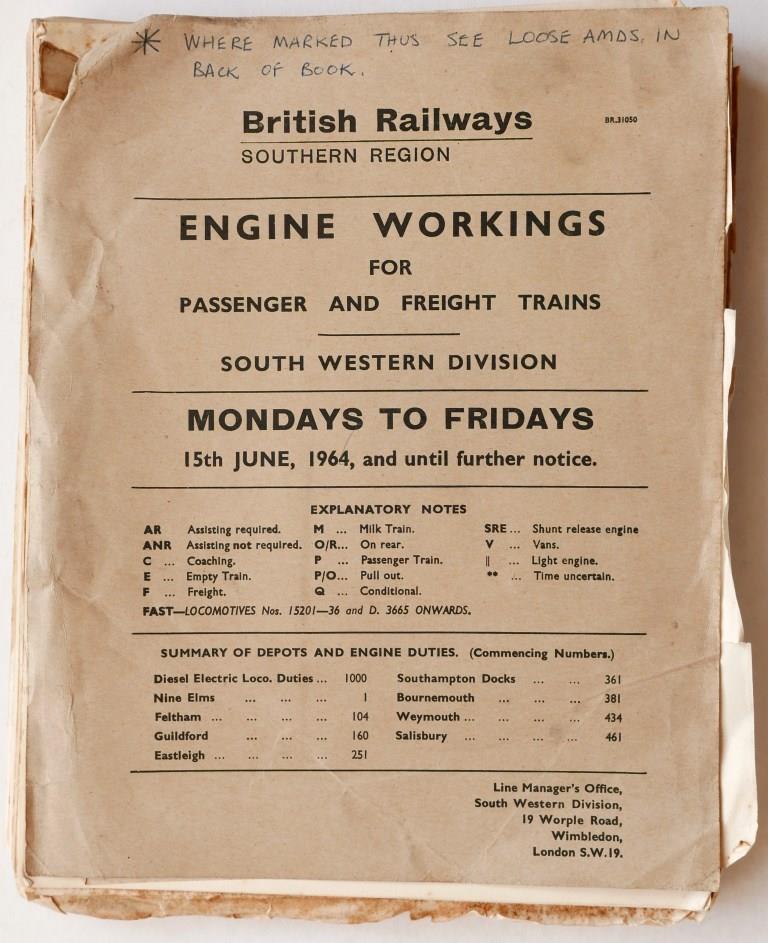 | 94 | BR(S) South Western Division booklet ‘Engine Workings for Passenger and Freight Trains – Mondays to Fridays’. Card covers, 161pp dated June 1964. No rear cover, amendments added, well used condition. | £65 |  |