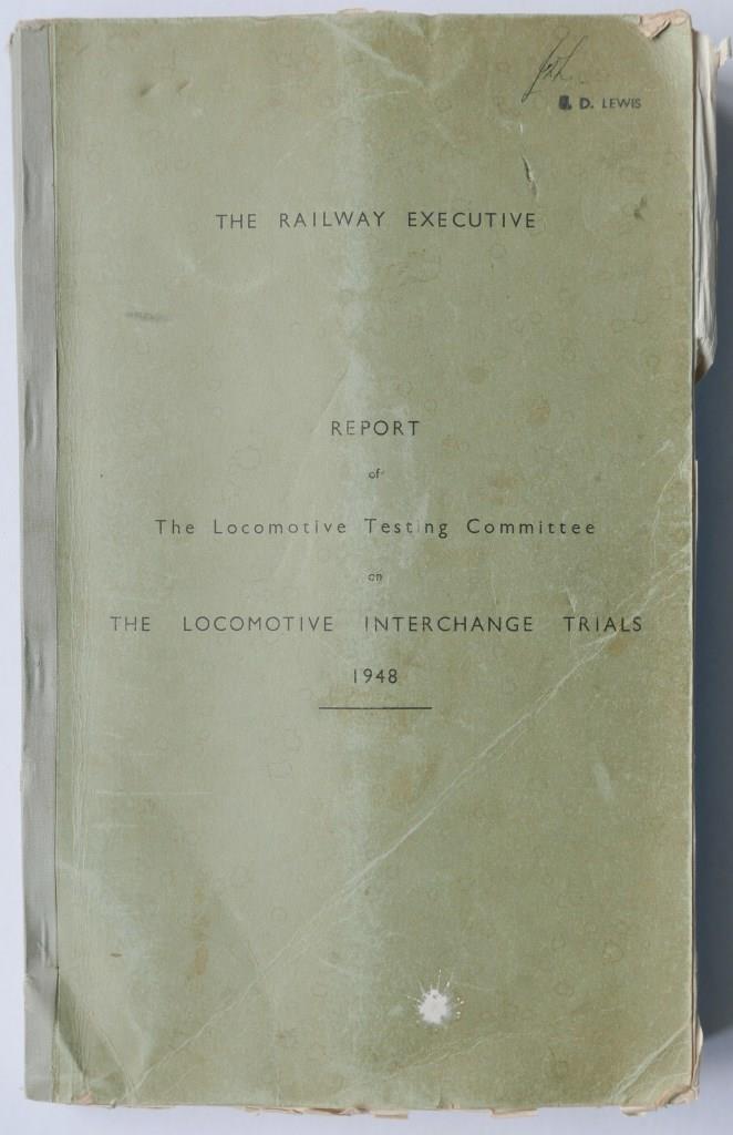 | 95 | Railway Executive report of the Locomotive Testing Committee on the Locomotive Interchange Trials 1948. Foolscap sized, card covers, 131 typescript pages and fold out diagrams. Cover wear, contents OK. | £22 |  |