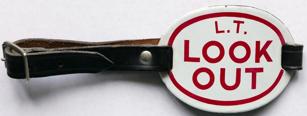 12LT ‘Look-Out’ armband. Red lettering on white enamel with company initials. Complete with original leather strap. Good condition. £9