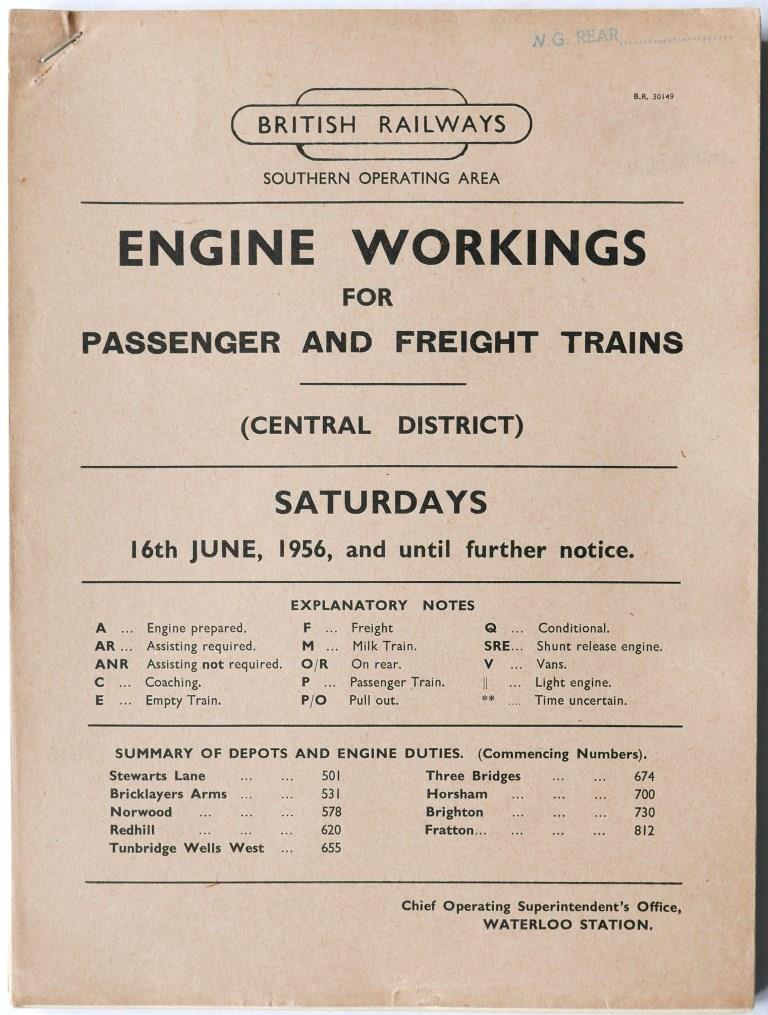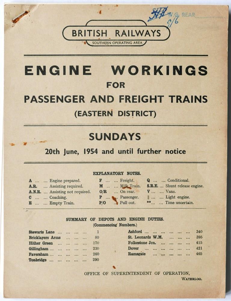 84BR(S) Eastern District booklet ‘Engine Workings for Passenger and Freight Trains – Weekdays’. Card covers, 318pp, dated June 1954. Some cover wear.£16