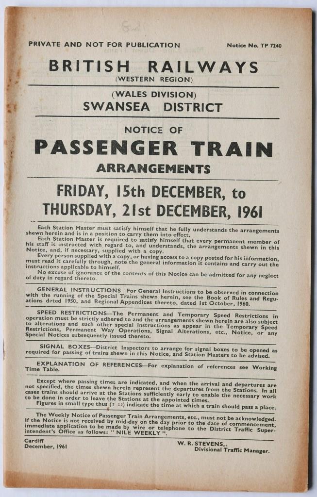 57BR(W) Wales Division Swansea District Notice No.TP7240 ‘Passenger Train Arrangements’. 35pp dated 15th December 1961. £120