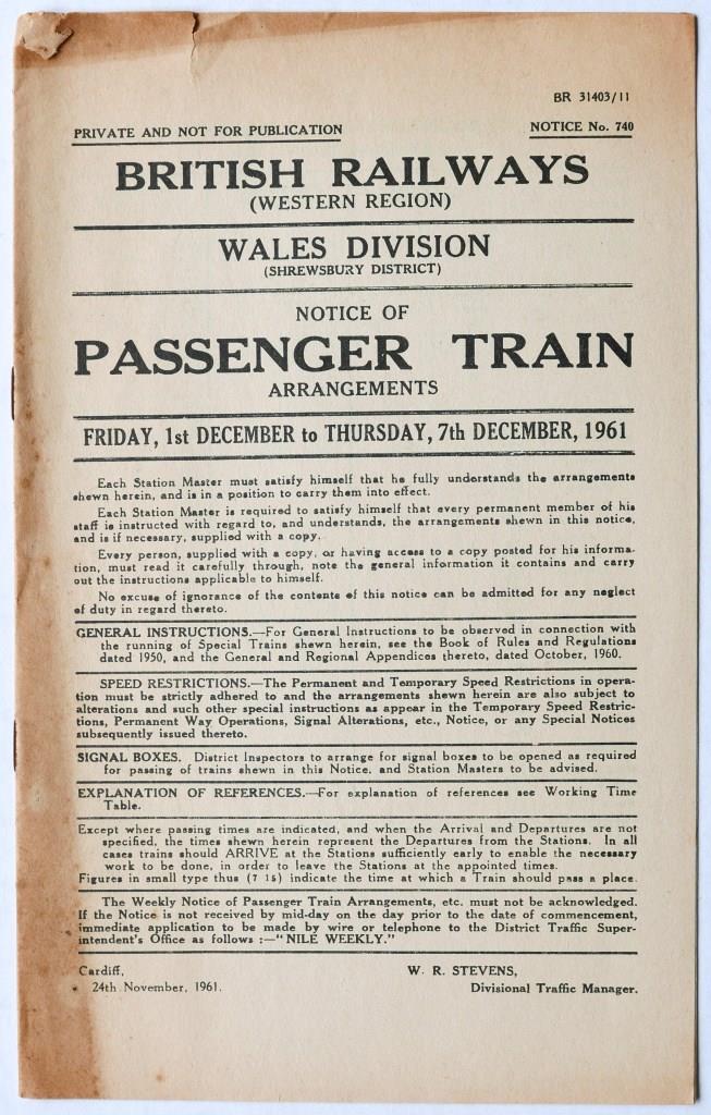 58BR(W) Wales Division Shrewsbury District Notice No.740 ‘Passenger Train Arrangements’. 7pp dated 1st December 1961. £22