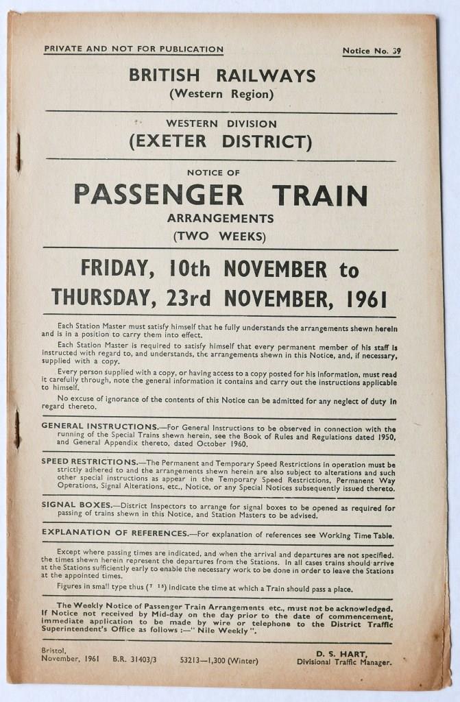 60BR(W) Exeter District Notice No.39 ‘Passenger Train Arrangements’. 6pp covering two weeks, dated 10th November 1961. £22