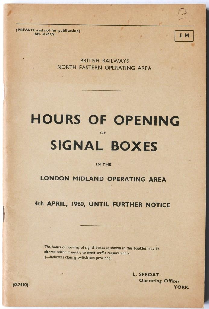 70BR(NE) booklet ‘Hours of Opening of Signal Boxes in the London Midland Operating Area’. 62pp dated April 1960. £19