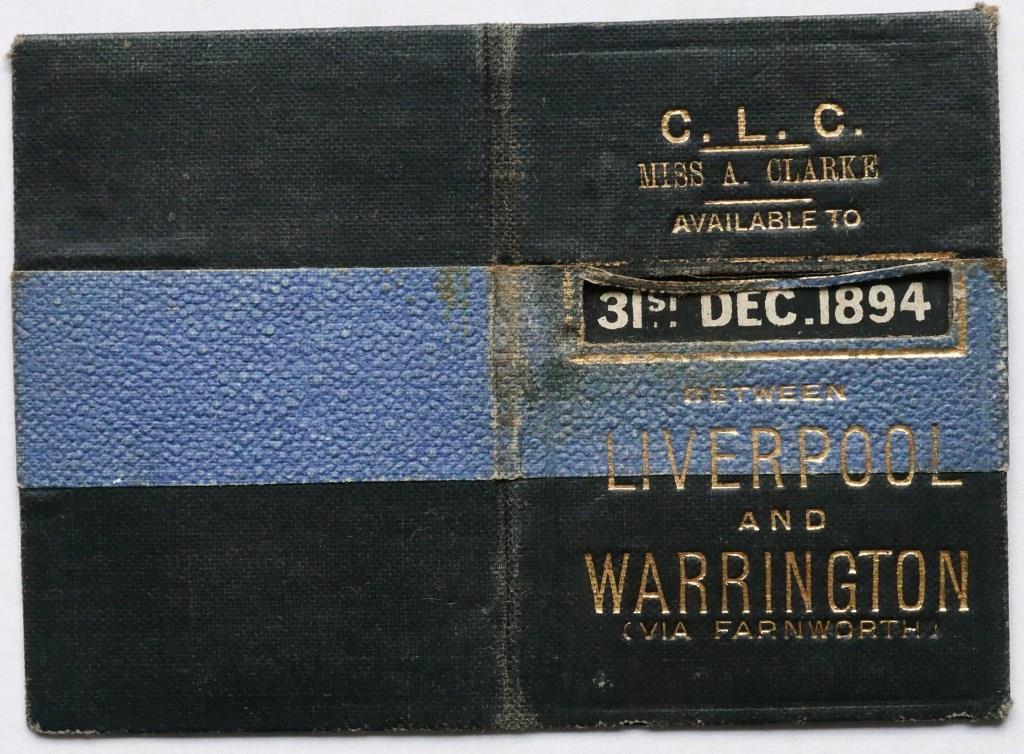 710CLC 3rd class season ticket for use between Liverpool and Warrington via Farnworth. Part leather bound card with route and date in gold on cover. Issued 1894. £90