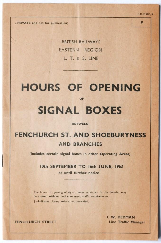 72BR(E) LT&S Line booklet ‘Hours of Opening of Signal Boxes between Fenchurch St and Shoeburyness and branches’. 9pp dated September 1963. £24
