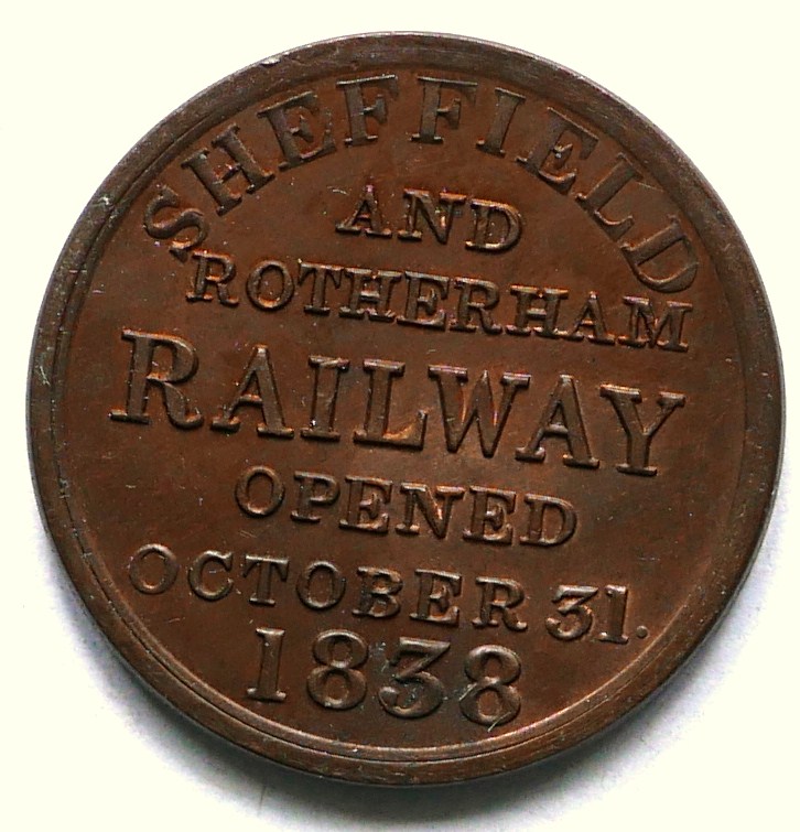 766Sheffield and Rotherham Railway brass ’Omnibus Check’ token. 1" diameter with ’Omnibus No.3 Check’ on front and ’Sheffield and Rotherham Railway Opened October 31st 1838’ on reverse. £16