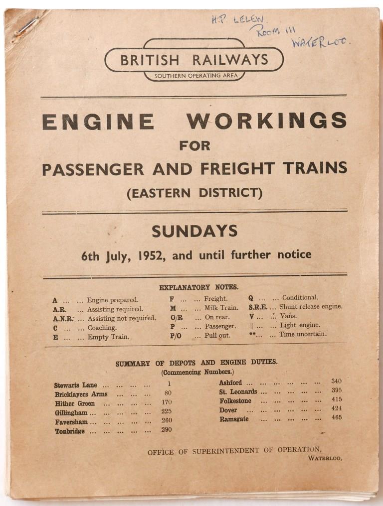 85BR(S) Eastern District booklet ‘Engine Workings for Passenger and Freight Trains – Sundays’. Card covers, 58pp, dated July 1952.£16