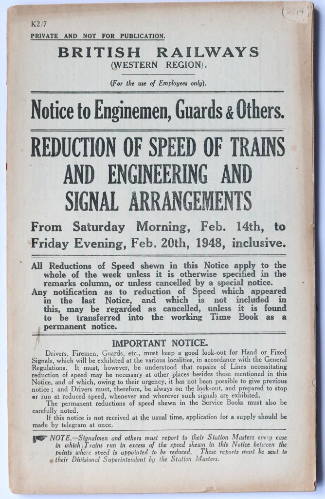 72BR(W) booklet ‘Temporary Speed Restrictions, Permanent Way Operations etc’. No.K2/161 dated 19th July 1952. 92pp. £55
