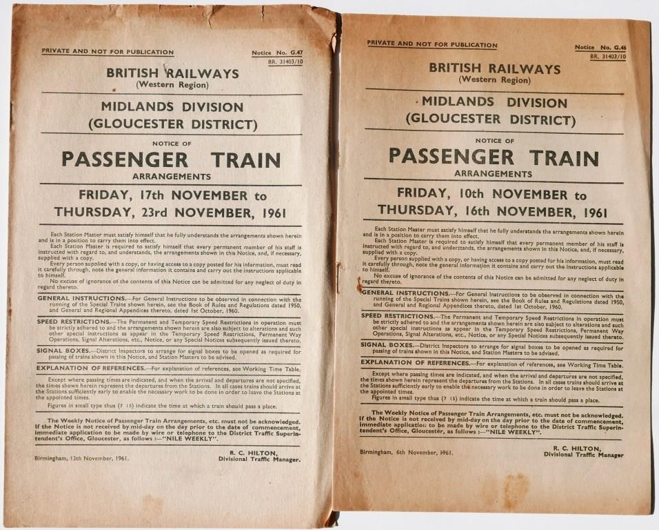 63BR(W) Midlands Division Gloucester District Notice No.G46 ’Notice of Passenger Train Arrangements’. 88pp dated 10th November 1961. Plus similar No.G47 dated November 17th 1961. £2