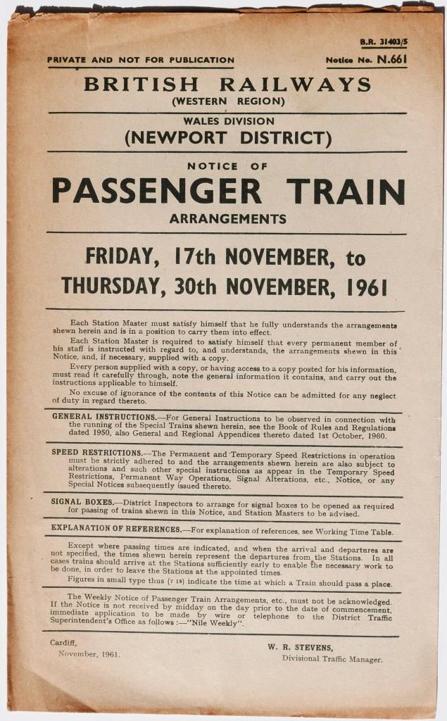 64BR(W) Wales Division Newport District Notice No.N661 ‘Notice of Passenger Train Arrangements’. 4pp dated 17th November 1961. £22