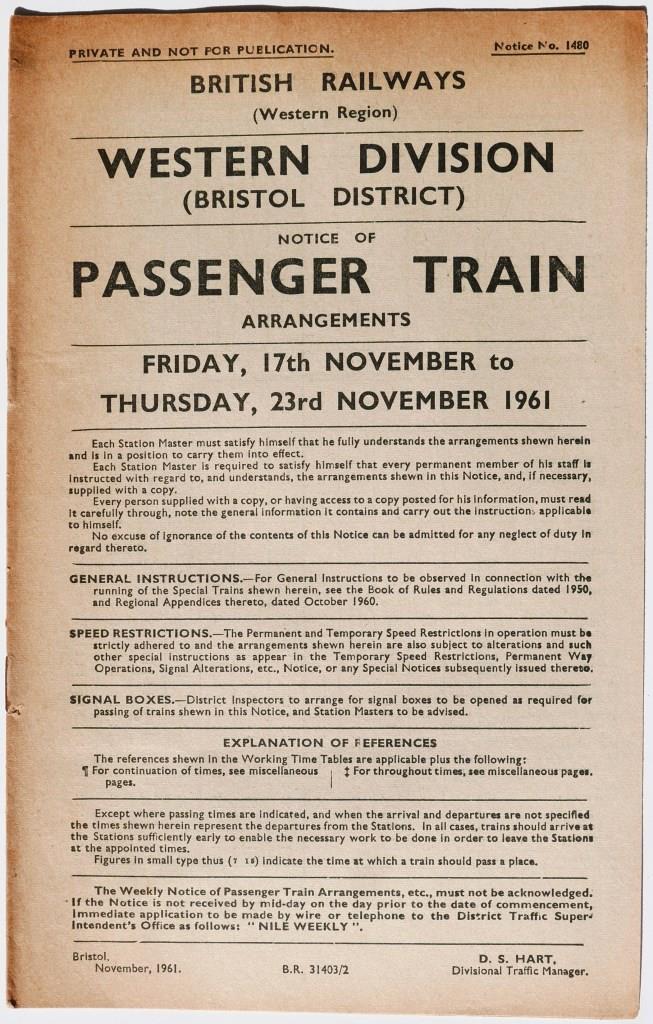 65BR(W) Western Division Bristol District Notice No.1480 ’Notice of Passenger Train Arrangements’. 8pp dated 17th November 1961. £22