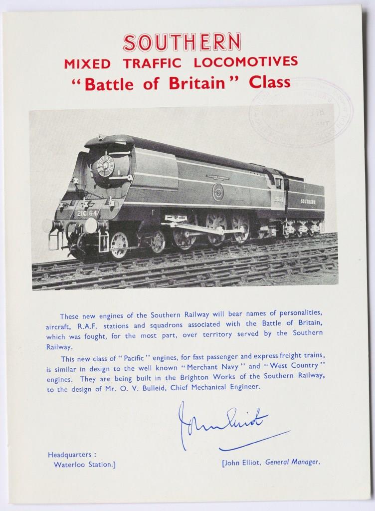 709SR naming ceremony leaflet for Battle of Britain class locos. Red and blue print with photo illustration of loco on front. Opens to show loco details with list of names on rear. Dated November 1947. £18