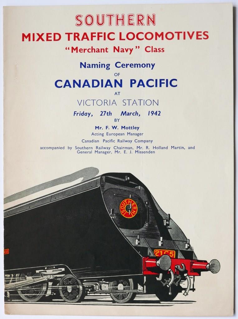 710SR naming ceremony leaflet for Merchant Navy class loco ’Canadian Pacific’ at Victoria Station on 27th March 1942. Red and blue print with colour illustration of loco on front. Vertical fold. £160