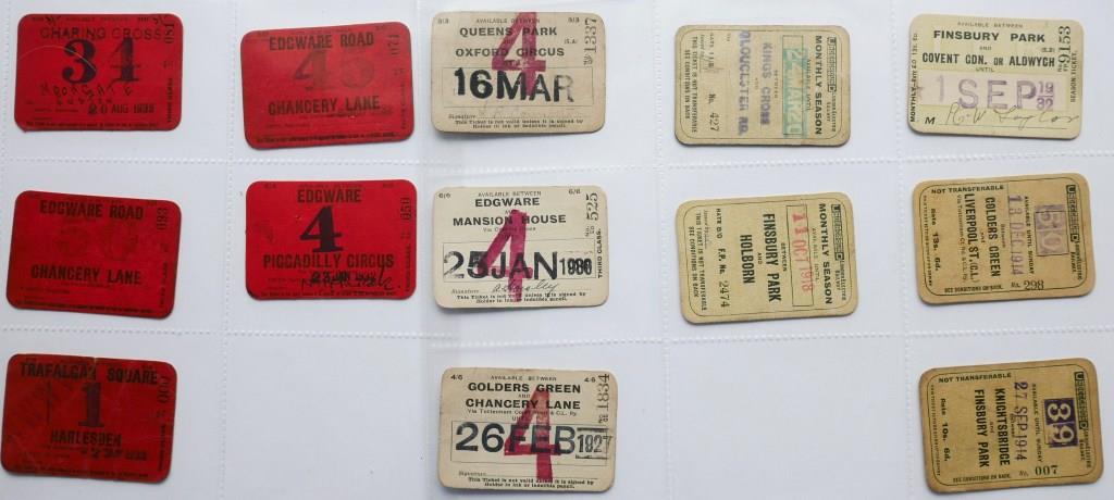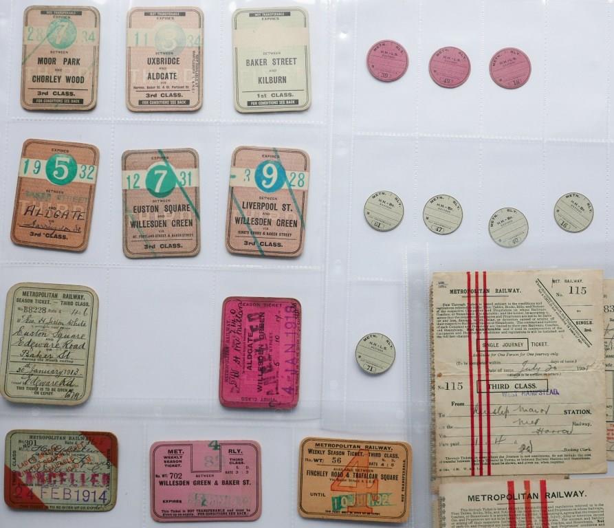 74714 Metropolitan Railway card season tickets in various styles. All issued. Plus 8 season tickets designed to fit into a small, circular, metal holder. All unissued. Also 11 paper tickets of various types. £65