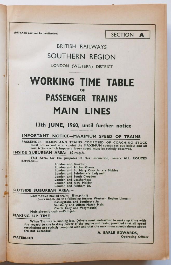 | 109 | BR(S) London Western District sections A – C, Southern District section E, Western District section G working timetable of passenger trains. 800+pp in hardback covers, dated June 1960. | £32 |  |