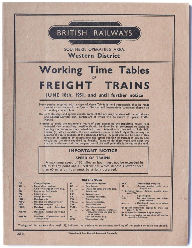 | 119 | BR(S) Western District working timetable of freight covering the west of England branches. 49pp dated June 1951. | £55 |  |