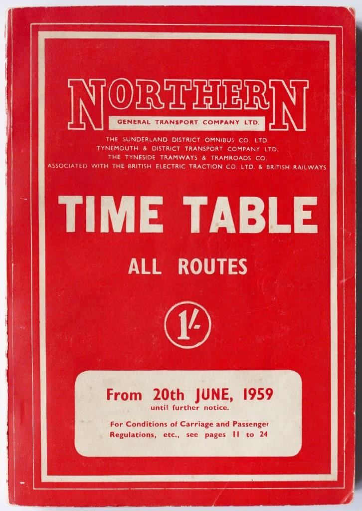 | 129 | Northern General Transport Co timetable booklet. Red and white card covers, 346pp plus fold out map, dated June 1959. | £11 |  |