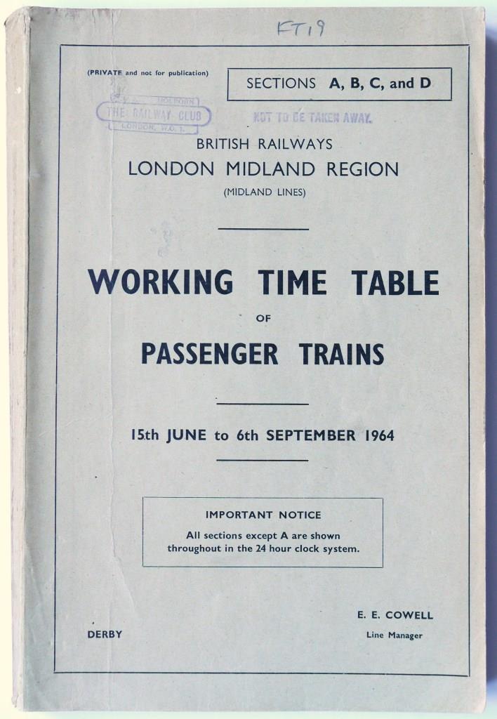 | 51 | BR(M) Midland Lines sections A - D working timetable of passenger trains. 200+pp dated June 1964. | £8 |  |