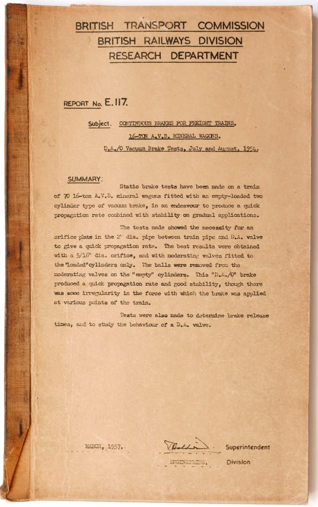 | 96 | BTC/BR foolscap sized report on continuous brakes for freight trains. 11 typescript pages plus tables and charts. Dated March 1957. | £17 |  |