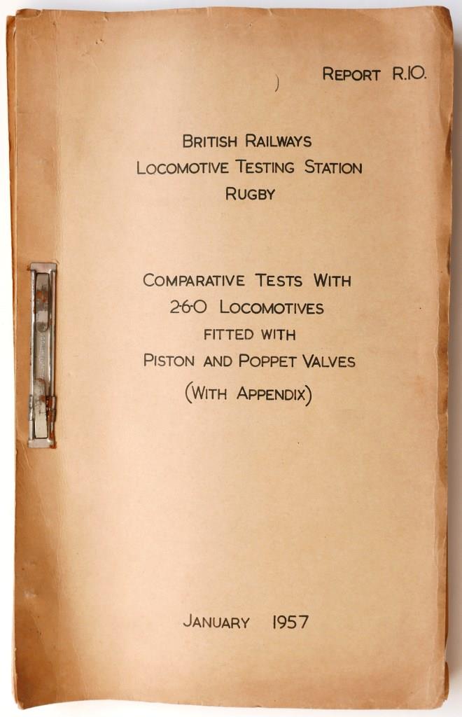 | 98 | BR foolscap sized report ‘Comparative Tests with 2-6-0 Locomotives fitted with Piston and Poppet Valves’. 8 typescript pages plus many tables and charts, dated 1957. | £38 |  |