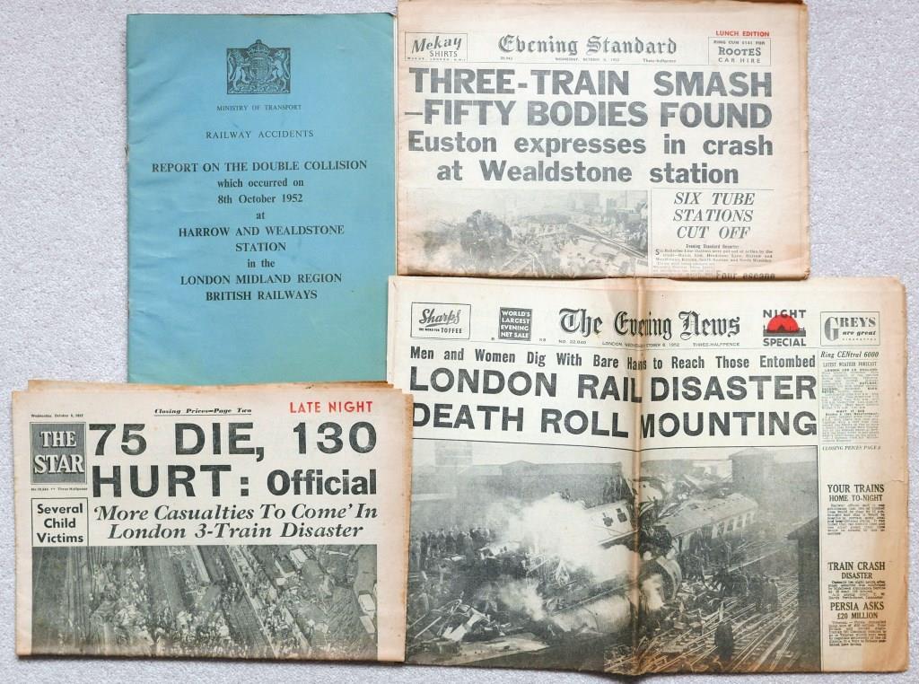 10Report on the double collision at Harrow & Wealdstone station on BR(M) on 8th October 1952 involving 46242. 37pp plus diagrams and photos. Blue covers. Plus Evening Standard, Evening News and The Star newspapers covering the event. £32