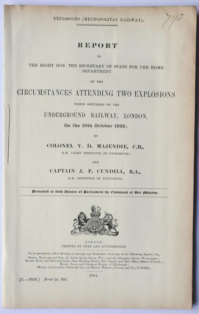13Secretary of State for the Home Office report on the circumstances attending two explosions on the underground railway on 30th October 1883. 19pp plus plates. £11