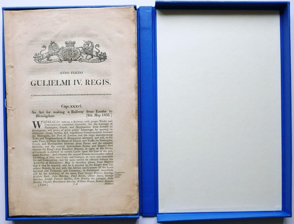 19Act for building a railway between London and Birmingham, dated 1833. 136pp, stored in modern, hardback slipcase with title in gold on spine. Click here for second image£75
