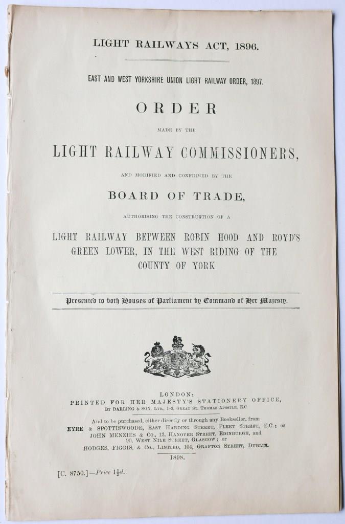 31East and West Yorkshire Union Light Railway order under the light railways act to allow the construction of the railway. 12pp, disbound, dated 1898. £2