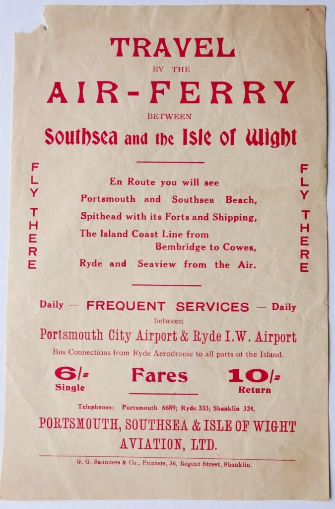 43Portsmouth, Southsea and Isle of Wight Aviation Ltd handbill advertising the Air - Ferry between Southsea and IOW. Red print, circa 1930s. Small string tear and loss top l/h corner. £10