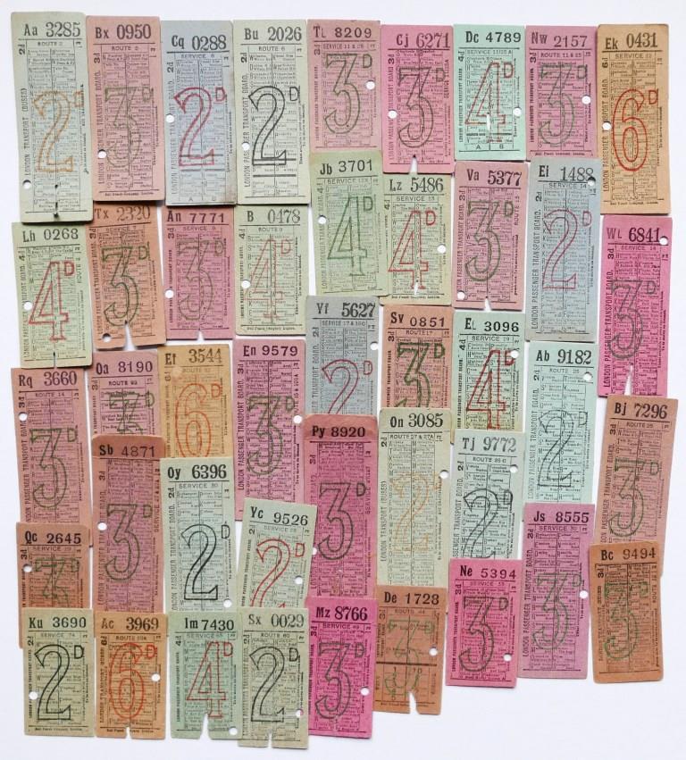 765Approx 70 LPTB and LT(Buses) fareboard type geographical punch tickets from routes between numbers 2 and 96 from the 1933 – 40 period with values between 2d and 6d. No apparent duplication. £28
