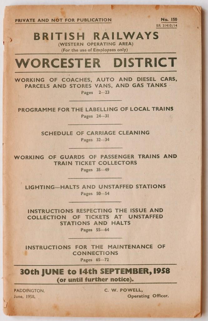 | 110 | BR(W) Worcester District notice No.150 covering working of coaches, auto & diesel cars, etc, labelling of local trains, schedule of carriage cleaning, working of guards, etc. 72pp dated June 1958. | £110 |  |